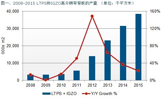 图一、2008-2015 LTPS和IGZO高分辨率背板的产量 (单位:千平方米)