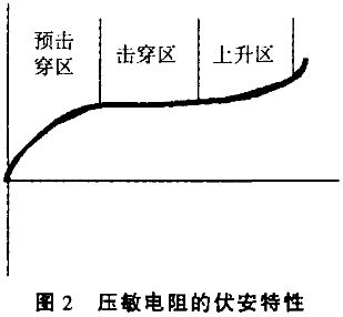 普通压敏电阻器的伏安特性见图3 ,它并联在电子镇流器的电源输入端,熔断保险丝的后端(图1) ,线路的?;し绞街饕邢嘞哂肓阆叩姆阑ぃ嘞哂氲氐姆阑?,零线与地的防护。其外形结构见图4。