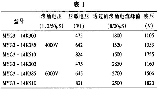 在选择压敏电阻器时,要充分考虑电子镇流器的实际工作环境因素,满足线路的安全防护要求。表1 为部分不同型号的压敏电阻器在不同浪涌电流峰值下的残压试验情况,从表中可以看出,选择的压敏电压值越高,残压越高(相同峰值电流情况下) ,同一型号的压敏电阻器经受的峰值电流越大,残压也会有所加大。