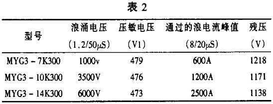 另外,表2 为一组Ф7、Ф10 或Ф14 等不同片径的压敏电阻器通流试验情况,从表中可以看出,对于不同片径的压敏电阻器,其所能承受的浪涌电流也不一样。通常,对于使用同一配方制作的压敏电阻器,片径越大,压敏电阻器能承受的最大峰值电流也就越大,相应的残压也会有所增加,但其增加的程度远远低于通流的增加幅度。因此,选型时,应根据线路的耐压水平,外界可能产生的电涌电压,尽可能选择通流比较大的压敏电阻器,以保证线路长期持续的正常工作。