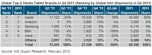 2011年全年,苹果iPad出货量为4050万台,比2010年增长168%,不过市场份额从2010年的87%下降到62%。三星全球年出货量为611万台,市场份额为9%。亚马逊Kindle Fire只在第四季度上市,因此全年市场份额只有6%。邦诺的Nook和华硕分列第四和第五,市场份额分别为5%和3%。