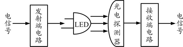 如图1 所示,白光LED 通信系统的发射端是根据传递资料将电信号变调,再利用LED 转换成光信号发送出去,接收端利用光电探测器接收光信号,再将光信号转换成电信号,经过解调当成信号资料读取。