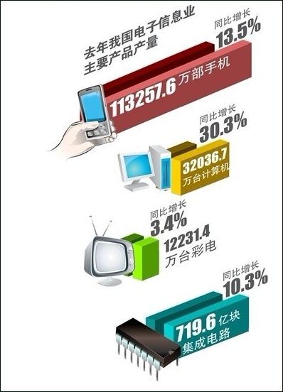 近日,工信部发布《2011年电子信息产业统计公报》,在2011年,我国彩电、手机、计算机等主要电子产品产量占全球出货量的比重分别达到48.8%、70.6%和90.6%,均名列世界第一。