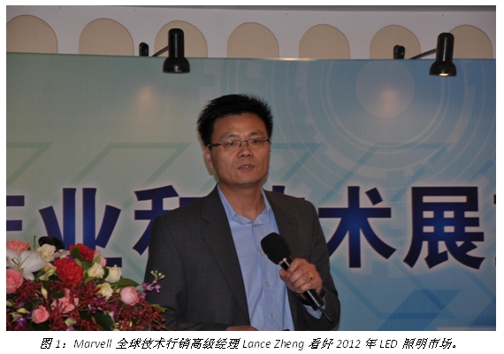 有业内人士说,2011年LED库存过大,会使2012年的市场不如2011年。对此观点,Marvell公司全球技术行销高级经理Lance Zheng有不同看法,“国内装机量非常多,这个是造成产能过剩的原因,但提高光效会是刺激LED行业发展的非常好的方式,因为光效一提高所用的LED数量就会小,因此能降低成本,促进LED市场发展。至于说2012年整个产业应该还是保持增长,这里的亮点就是LED照明。”他在“2012产业和技术展望媒体研讨会”上这样表示。
