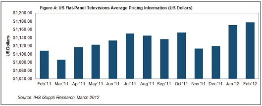包括液晶与等离子电视在内的平板电视平均销售价格,2月份达到1177.20美元,比1月份的1170.42美元上涨0.6%。自11月最后一次出现下降以来,电视价格稳步攀升。2月价格也是至少12个月以来的最高水平,如图1所示。