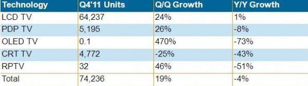 2011年第四季全球电视出货量较去年同期下降4%,为7千420万台。液晶电视出货量仅上升1%,为2004年以来最低;等离子电视下降了8%,CRT电视下降了43%。日本和西欧市场降幅最大,北美也仅维持少量增长,第四季度三个地区的电视总出货量较去年同期下降了21%。新兴市场电视出货持续成长,增幅为12%,其中液晶电视出货成长了20%。
