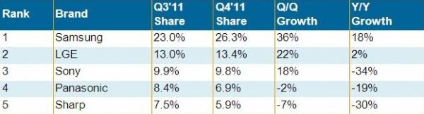 2011年第四季度,三星全球平板电视营收占比提高到26.3%,为所有品牌历史最高,且较第三季度提高了三个百分比。此外,在液晶电视和等离子电视方面,三星营收占比仍然遥遥领先,且等离子电视占比首次超过松下而居于首位;三星也是3D电视和LED电视市场的领先品牌。乐金电子为全球第二大品牌,占比为13.4%,且是除了三星以外唯一一个前五大品牌中在第四季度取得营收成长的品牌。索尼排名第三,营收占比为10%,但较去年同期下降了30%以上。