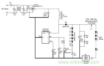 美国安森美公司加了一个功率因素校正芯片NCP1014的恒流二极管的电源,其电原理图见图12。