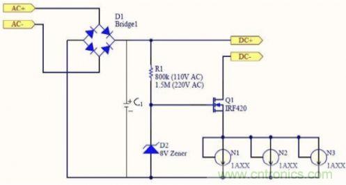 在这里,恒流二极管的作用就是要在输入市电电压变化时,保持输出电流不变。但是由于恒流二极管的耐压有一定的限制,所以它所能吸收的电源电压变化也是有限 的。就拿100V耐压的CRD来说,用在220V市电电源里,都还只能对付有限的电压变化。220V经过桥式整流以后它的输出直流电压大约为264V。如 果市电变化+10%,~-15%,就相当于整流后为290~187V,电压变化103V。已经超过其耐压了。假如所用的LED为80颗,那么总电压为 264V,正好相当于220V经过桥式整流以后的值。这时候恒流二极管上没有压降,但是这时候它是不能工作的而至少需要10V压降,也就是要求整流后电压 为274V,市电电压为228VAC。那时候恒流二极管压降为最小,功耗也最小,只有0.03Ax10V=0.3W,整体效率为最高可达96%(当然还要 考虑整流器的效率,实际上还会低一些)。如果市电增高至242VAC,那么恒流二极管电压就增高为26.4V,其功耗也增加到0.79W,这时候效率就等 于91%。