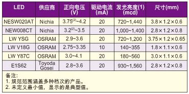 LED技术持续快速改进,制造商在使用新的材料、制造技术和LED设计来为同等大小的电流释出更大的光输出,这样一来,几年前需要4个LED进行背光的显示屏如今可能采用2个LED就能实现同样的背光亮度。不仅如此,过去通常使用冷阴极荧光灯(CCFL)进行背光的4到7英寸较大显示屏,如今正在转向使用LED进行背光。此外,LED的正向电压正趋向更低。因此,不仅需要考虑驱动器制造商的数据表曲线上的驱动器效率,还需要基于采用所选LED对驱动器进行的评估来予以考虑。表1列举了几款LED的一些重要规范,显示了这些LED在正向电压和发光亮度等方面的差别。需要说明的是,正向电压范围的变化较大,这意味着驱动器的效率应该采用LED规范的极限值来进行评估。