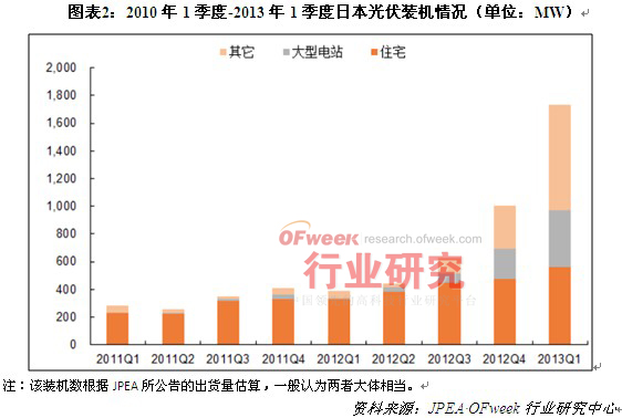 导读: 根据日本经济贸易产业省公布数据显示,2012年日本光伏新增装机2.5GW,其中住宅项目为1.6GW,占比65%;2013年第一季度,日本新增装机1.7GW。