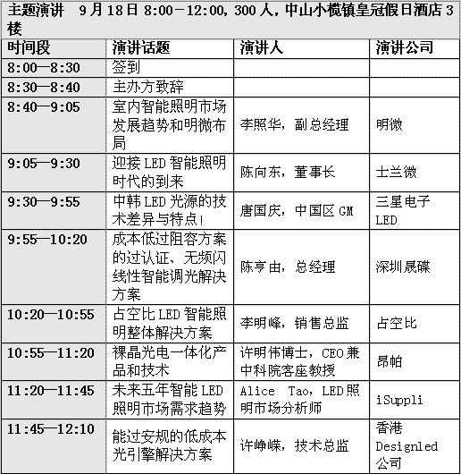 演讲主题有:未来五年智能LED照明市场需求趋势、当前LED灯具制造商面临的四大发展陷阱、明微在智能调光市场布局和现有解决方案、占空比智能LED照明整体解决方案、成本低于阻容方案的线性恒流方案、崛起中的数字有线智能LED调光解决方案、外围只需一个桥堆芯片的高集成度过安规光引擎解决方案、无频闪低成本智能LED调光线性恒流方案、光引擎的技术发展和市场需求趋势、中韩LED光源的技术差异和购买指南、目前LED驱动电源技术开发和市场需求趋势、低成本动态LED景观照明解决方案和依托临江开发中国东部沿海LED照明市场。[page]