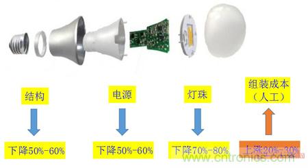 从上图表示,LED光源产品无论是从结构,电源还是灯珠,成本都有大幅下降至少50%,然而人工组装成本却涨幅近20%-30%。晶丰明源销售总监李宁在第六届华强国际LED照明市场战略暨创新技术研讨会上表示:“晶丰明源将持续提供更高性价比的整体电源方案来提高客户的竞争力,其次,实现全自动化生产,提高效率,从而帮助客户降低人工成本。”
