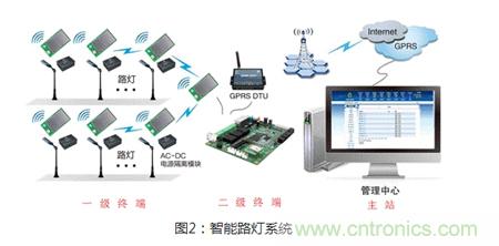 那么路灯是如何控制亮度协调工作的呢?下图则是路灯控制系统的整体系统示意图,在每个路灯节点上由一级终端设备将路况和环境信息通过ZigBee无线传送给二级终端ZigBee集中器,通过它将信号转为公网用的GPRS信号,最终传递给我们的管理中心,管理中心人员根据传回来的信号,做出相应的控制,调节每个节点的亮灭及亮度。