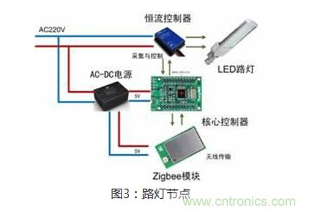 这是我们的一级终端,每个路灯节点由ZigBee无线???、核心控制板、光线及人流传感器和LED灯组成。每个节点通过ZigBee接收命令,并实时汇报每盏路灯的亮、灭情况、实现亮度调节、传送电能负荷状态、完成灯杆损坏报警与漏电报警、接收来自ZigBee集中器的查询命令、控制命令等。