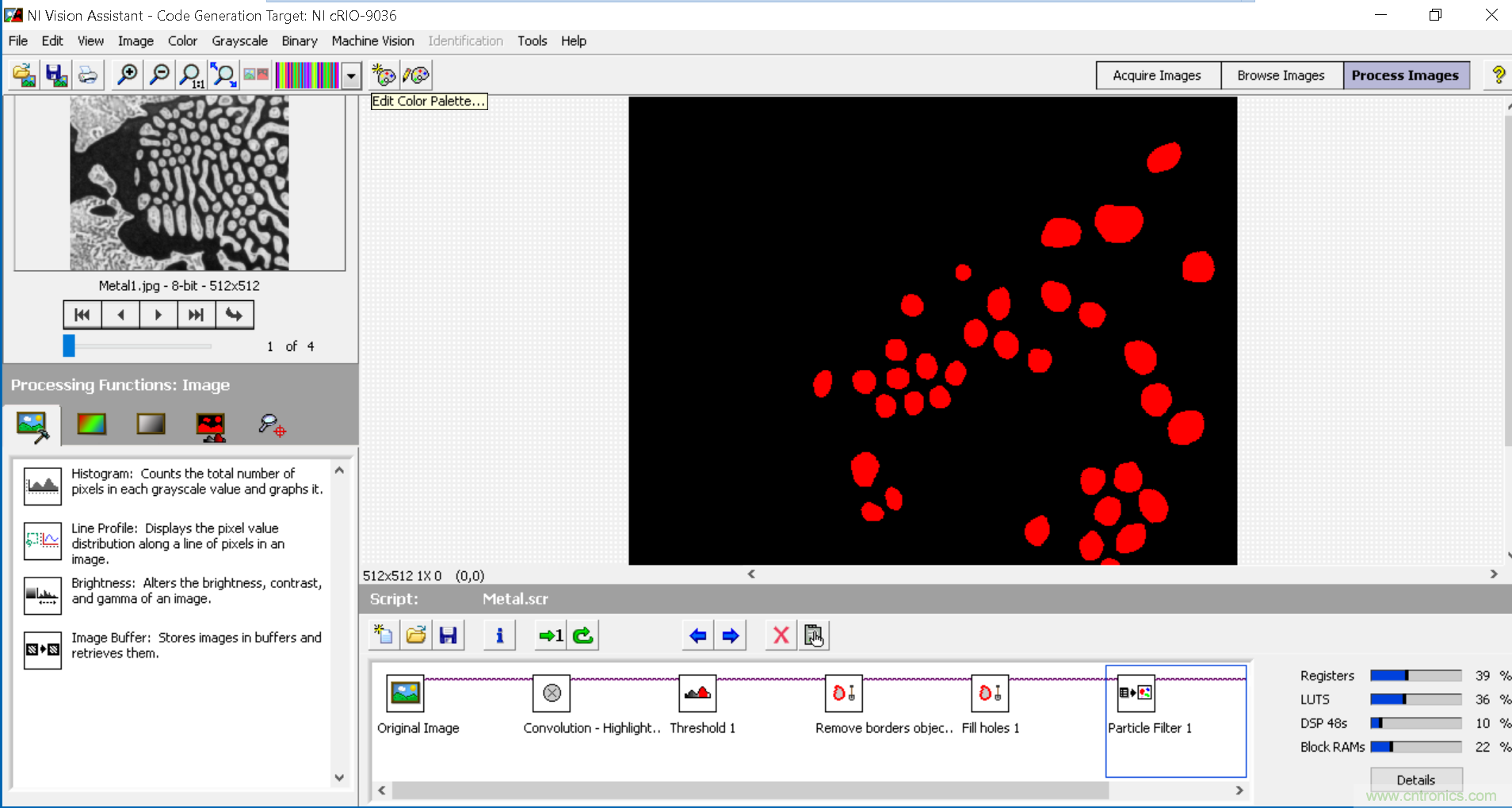 为了实现生产率的最大化,不论使用哪种处理平台,都需要立即获得关于算法的反馈和基准测试信息。当使用迭代探索性方法时,实时查看算法结果将会节省大量时间。什么是正确的阈值?用二进制形态滤波器剔除的颗粒多大或多???哪种图像预处理算法和算法参数可以最好地清理图像?这些都是开发视觉算法时的常见问题,而关键在于是否能够更改并快速查看结果。然而,传统的FPGA开发方法可能会减缓创新,因为算法的每个设计变化之间需要编译时间??朔庖坏愕囊桓龇椒ㄊ鞘褂靡桓鏊惴⒐ぞ撸扇媚谕桓龌肪辰蠧PU和FPGA的开发工作,而不会在FPGA编译时陷入困境。NI Vision Assistant是一种算法工程工具,用于开发部署到CPU或FPGA上的算法,以帮助您简化视觉系统设计。您还可以使用Vision Assistant在目标硬件上编译和运行之前测试算法,同时轻松访问吞吐量和资源利用率信息。