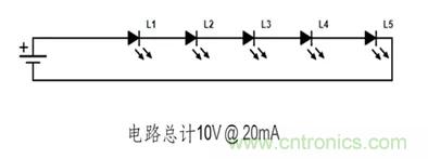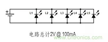 【导读】LED电路的接线方式决定了电路正常工作所需的电压和电流。下方两条电路使用了五个160-1445-1-ND LED。单个LED电压2V 20mA。如您所见, 每条电路所需的工作电压和电流之间存在显著差异。
