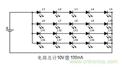 一般说来, 大多数LED照明都使用串并联组合。如下图: