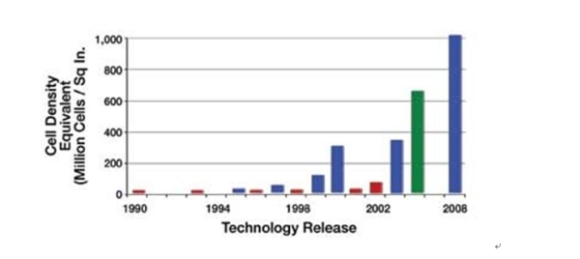 图2显示了Fairchild公司≤30V的N沟道MOSFET单元密度的进步。每个条形都表示新的工艺进步。可以看到,在最近的十年中,单元密度从3200万单元/平方英寸增加到现在的10亿单元/平方英寸。