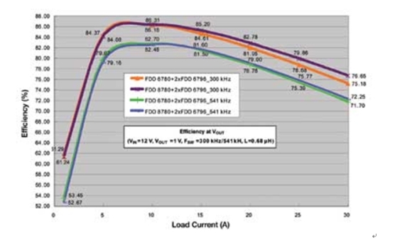 注意上面的两条曲线,在满载(30A)时,可以看到最新的器件的效率有1.5%的改进。同样还是这两条曲线,在负荷较?。?5A)时,可以实现0.69%的改善。如果对整个负荷范围积分,那么与今天常见的方案相比,使用最新的MOSFET器件时平均功率损耗可以降低8%~10%。即使在较高的开关频率541kHz处,可以看到在负荷小时系统级效率仍然高于80%,而在满载时效率大于70%。如果频率继续增加,那么开关损耗将急剧增加。