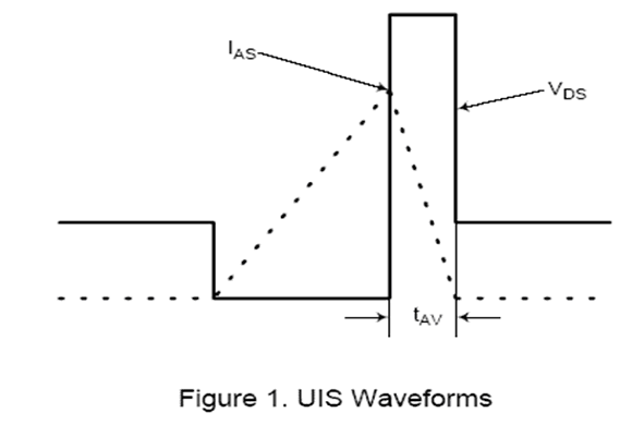 一般评估场效应晶体管的崩溃效应皆以单一脉冲 UIS 为基准。如图一所示。此方式简单的定义了几个针对被测试组件的基本参数。例如在崩溃时间内所流经场效应晶体管的最大峰值电流 (IAS), 在 UIS 开始前的起始接合面温度 (Tj), 以及崩溃时所经过的时间 tAV 。 将 IAS 及 tAV 所对应出来的图表曲线可提供使用者了解此组件针对 UIS 的表现能力 , 而提供一个客观且公正的衡量依据。