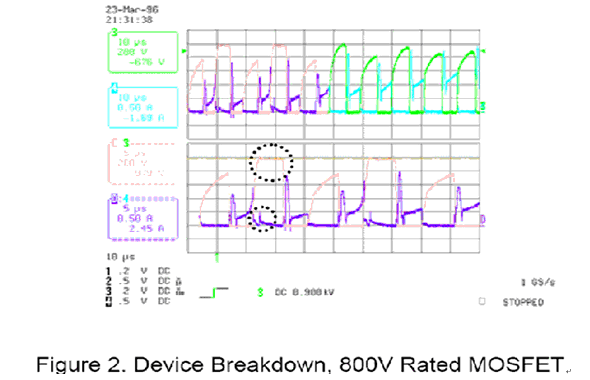 当场效应晶体管进入崩溃效应时 Drain 及 Source 电压会被嵌制在其崩溃电压 , 而电流会经由寄生的二极管而产生逆向操作电流的现象。如图二所示为一典型开关式电源电路所量测到的崩溃现象。从图中可看出 Drain 及 Source 的电压 (CH3) 被箝制在 1KV 而且逆向电流 (CH4) 可清楚地被发现。