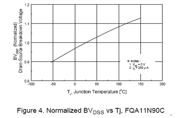 一般而言 假使 Drain 及 Source 电压超过规格书所载明的最大额定电压稍大一些 , 此时要让场效应晶体管产生崩溃现象其实是不常发生的。图四所表示的曲线为场效应晶体管的额定最大工作电压 (BVDSS) vs 接合面温度 (Tj), 其特性的表示是以正温度特性变化 。当接合面温度达到 120 ° C 时 , BVDSS 可达到将近 990V 。由此可知 , 在更高的接合面温度条件下 , 场效应晶体管需要更高的 Drain 对 Source 的电压以达到崩溃效应产生的必要条件。