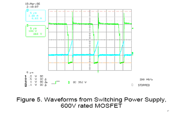 但这里必须提醒一件事 , 图四所标示的 BVDSS 是基于 250uA 的 ID 电流为条件所定义。在实际崩溃发生时 ID 电流远大于 uA 的范围。 因此 , 所欲达到的崩溃电压也会比上述图四中所推导的电压要来的大的多。就实际的考量而言 , 场效应晶体管的实际崩溃电压一般是额定低电流崩溃电压的 1.3 倍。以图五为例 , 它所表示的是一个超过最大额定电压但并未进入崩溃现象的波形 ,Drain-Source 的电压已达到 668V > 600V 但并未嵌制于崩溃效应。
