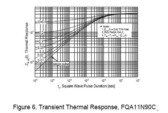 举例说明 , 当一个 2KW 的电源脉冲加至 FQA11N90 的脉冲时间为 1uS 时 , 我们可依据图六的曲线算出此脉冲功率对接合面所产生的温升为
