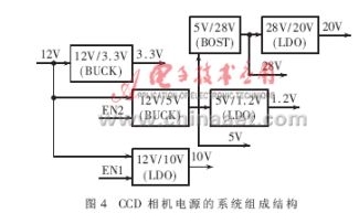 CCD 相机中的图像信息的流动和变换是通过相机中的FPGA/CPLD时序发生器的驱动和MCU的控制管理下完成的。整个CCD相机正常工作需要以下6种稳压电源,它们的电压值和最大输出电流分别是:28V@30mA、20V@50mA、10V@100mA、5V@20mA、3.3V@300mA和1.2V@30mA。