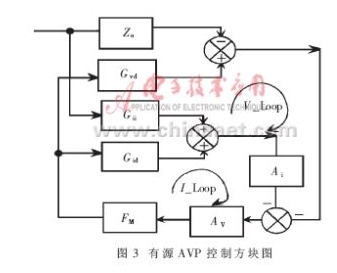 AVP有源控制为双环控制,其基本原理如图2所示。通过检测电感电流,根据降压要求相应调节输出电压的基准。输出电压跟随基准电压而实现AVP控制。图3为AVP有源控制的方块图,假设电流环增益为Ti,电压环增益为Tv,则: