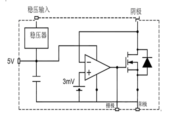 实现与两端整流器功能相当的器件,必须包括一个MOSFET,一个控制该器件以及内部偏置电源的非??焖偾曳浅C舾械牡缏?。这样的电路如图1所示。