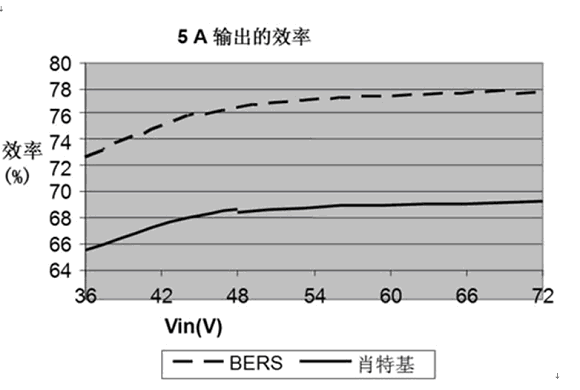 用非连续模式反激转换器对这一器件进行测试。它设计工作在36到72 Vdc的标准电信输入范围内。根据此器件的初始测试,测量到效率明显地提高。以肖特基二极管(MBRB4030),然后以BERS(NIS6111)同步整流器进行效率测试。功率FET的温度也明显降低,因为电路中同步整流器产生的功率也下降了。图2所示 5安培负载条件下,FET温度下降了20℃到40℃。从而能节约散热器并提高可靠性。