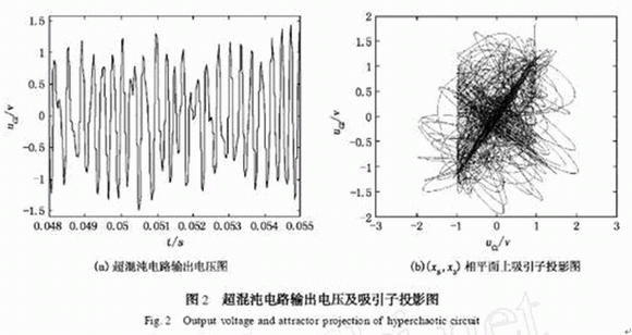 典型超混沌信号及相图如图2(a)、(b)所示,此时超混沌信号对应的李雅普诺夫指数为:λ1=0.042λ2=0.008,λ3=0.000,λ4=-0.067。用于计算机模拟中除图中给出的超混沌信号外,对应的混沌和亚超混沌信号的李雅普诺夫指数分别为:λ1=0.029,λ2=0.000,λ3=-0.038,λ4=-0.097和λ1=0.033,λ2=0.000,λ3=0.000,λ4=-0.073。