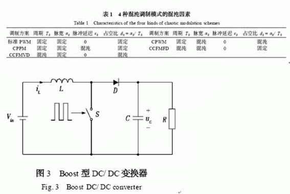 根据文献,混沌开关调制信号有表1以标准PWM为参照的4种调制模式。即标准PWM脉的参数由混沌序列调制的“混沌脉冲宽度调制”(CPWM)、“混沌脉冲位置调制”(CPPM)、“定占空比混沌载频调制”(CCFMFD)以及“变占空比混沌载频调制”(CCFMVD)。各种调制模式的具体调制过程为:对CPWM模式,开关导通时间由Ton=T/2+(x(n)-x)T/k决定,k=2;对CPPM模式,开关延迟时间位于[0,0.5T];对CCFMVD模式,与CPWM一样,使开关导通时间Ton=T/2+(x(n)-x)T/k随混沌序列变化,开关断开时间为0.5T,由于导通时间变化,断开时间固定,周期变化,占空比不定;对CCFMFD模式,每一个开关周期T(n)=T+(x(n)-x)T/k都是变化的,开关的占空比固定。两种混沌载频调制模式下k=2,占空比或平均占空比均为0.5。