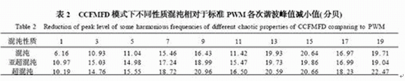 从表中给出的以标准周期PWM前19次谐波为参照的数据可以看出,分别在混沌、亚超混沌及超混沌信号调制下,各次谐波对应处的频谱数值都得到了明显的降低。在混沌信号调制下,谐波对应处的频谱数值平均降低14.87分贝(dB);在亚超混沌信号调制下,谐波对应处的频谱数值平均降低16.84分贝(dB);在超混沌信号调制下,谐波对应处的频谱数值平均降低17.86分贝(dB)。若以欧盟(89/336/EEC指令)电磁兼容性导则中限制设备输入电流谐波分量最大值幅度这一原则,来讨论不同性质混沌信号降低电磁干扰水平的效果,结论非常明显,即以超混沌信号作为开关调制信号源,比混沌能更好地降低电磁干扰水平。