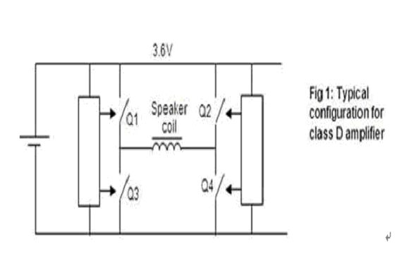 目前的移动电话通常使用D类音频放大器。这些放大器在一个H桥电路中采用了两对FET来控制扬声器线圈。配置如图1所示。Q1&Q4导通和Q2&Q3关断时向一个方向驱动扬声器线圈,Q1&Q4关断和Q2&Q3导通