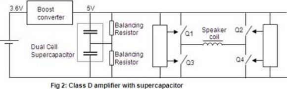 在没有超级电容的情况下(图1),我们将音频放大器连接到3.7V的锂离子电池上,并驱动一对8Ω扬声器。
