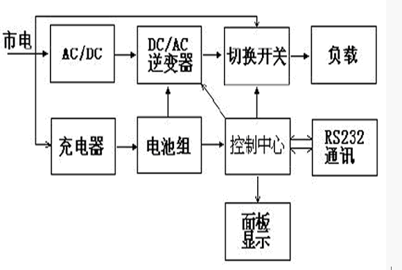 图1 为在线式UPS 的主电路,在线式UPS 电源具有独立的旁路开关、AC/DC 整流器、充电器、DC/AC 逆变器等系统,工作原理是:市电正常时AC/DC 整流器将交流电整流成直流电,同时对蓄电池进行充电,再经DC/AC 逆变器将直流电逆变为标准正弦波交流电,市电异常时,电池对逆变器供电,在UPS 发生故障时将输出转为旁路供电。在线式UPS输出的电压和频率最为稳定,能为用户提供真正高质量的正弦波电源。