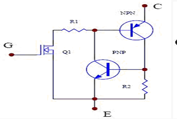 IGBT 有一定抗过电流能力,但必须注意防止过电流损坏。IGBT 复合器件内有一个寄生晶闸管,所以有擎住效应。图5 为一个IGBT 的等效电路,在规定的漏极电流范围内,NPN 的正偏压不足以使NPN 晶体管导通,当漏极电流大到一定程度时,这个正偏压足以使NPN 晶体管开通,进而使NPN 和PNP 晶体管处于饱和状态,于是寄生晶闸管开通,门极失去了控制作用,便发生了擎住效应。IGBT 发生擎住效应后,漏极电流过大造成了过高的功耗,最后导致器件的损坏。