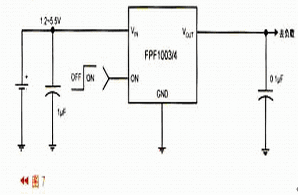 该器件典型应用电路如图7所示,输入电容一般为1μF,输出电容为0.1μF(都采用多层陶瓷电容器)。如在ON端加逻辑高电平时,开关导通(VIN=1.2V时,VIH≥0.8V;VIN=2.7~5.5V时,VIH≥2V);ON端加逻辑低电平时,开关关断(VIN=1.2V时,VIL≤0.35V;VIN=2.7V~5.5V时,VIL≤0.8V)。RDS(on)与VIN有关:VIN=5.5V时,RDS(on)≤30MΩ;VIN=1.2V时,RDS(on)≤150MΩ。