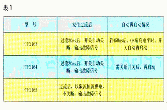 该系列FPF2163、FPF2164、FPF2165在功能上有一些差别,如表1所示。