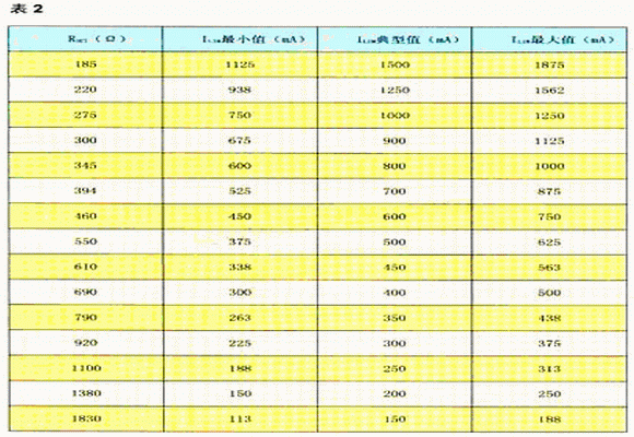 限制电流ILIM的设定与RSET有关,其关系式为:RSET=275.6/ILIM。式中RSET的单位为欧姆,ILIM的单位为安培。设定的限制电流有一定的允差,如表2所示。