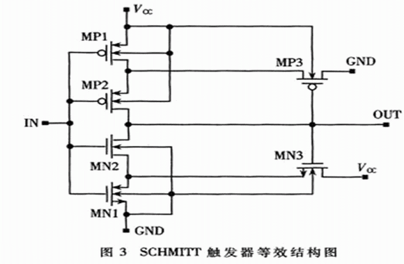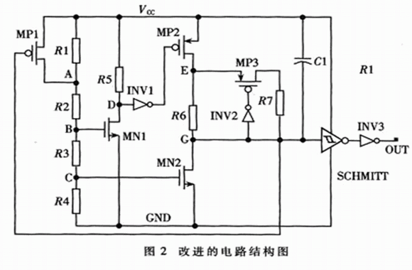 改进的电路如图2所示,电路结构由采样、先导控制、比较器、迟滞反馈回路、加速响应电路、缓冲器六部分构成。电阻R1、R2、R3、R4构成分压电阻网络实现对Vcc的采样;MNl、R5、INVl组成先导控制电路,实现对比较器灌电流的控制;MN2、R6、MP2组成比较器,实现采样电压与MN2的VTH比较;MP1构成正反馈回路,可实现Vcc的迟滞功能;INV2、MP3、R7构成正反馈回路,可加速比较器的翻转,从而提高电路的响应速度;SCHMITT触发器和INV3是缓冲电路,对比较器的输出波形进行缓冲和整形,SCHMITT触发器的结构如图3所示,其工作原理详见参考文献[3];另外,电容C1起滤波和储能作用。