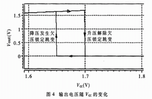 从图4的仿真的波形中可以看出:当增大电源电压时,电压低于1.7V为欠压锁定;当减小电源电压时,电压低于1.65V为欠压锁定。仍可进一步调整参数,以改变电源电压欠压阈值。