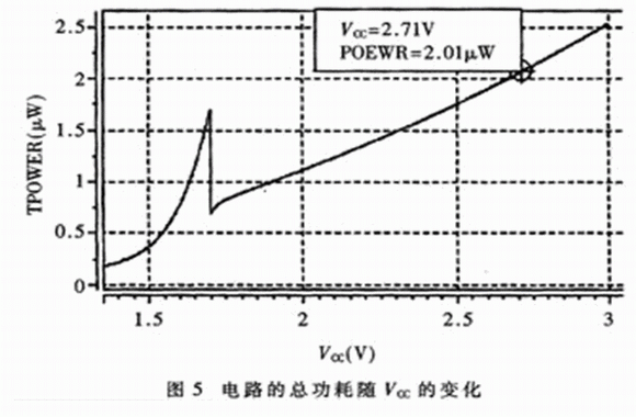 从图5的仿真波形中可以看出:当Vcc的电压正常时,电路的总功耗随着Vcc的升高而增大,当Vcc=2.7V时,总功耗约为2μW,可见电路的静态功耗很低。