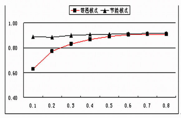 针对电源部分的损耗,户外电源的工作模式和室内电源是一样的,正常情况下为均流工作模式。市电正常时??楦涸芈式系停缭聪低炒蠖嗍挥泄ぷ髟谙低匙罴研是?,因此可以采用电源??樾菝呒际醺菹低掣涸刈刺?,动态调整工作模块数量,使系统始终工作在最佳效率区间,从而降低系统的能耗。图1表示了电源系统在普通工作模式下和节能模式下的系统典型效率比较。从图1可看出,采用休眠节能模式,电源系统的效率在整个负载范围内基本保持不变,有效的降低了电源系统在低负载条件下的能耗。另一方面,对于户外电源来说,电源系统效率提高会降低设备仓的发热量,降低设备仓的温度。