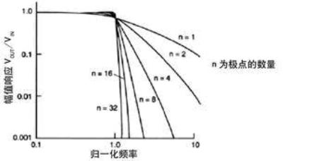 图1 几个低通滤波器的幅值响应与归一化频率的关系曲线。如果滤波器传递函数有多个极点(或阶数),则频率越高,衰减越快。