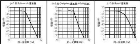 Bessel滤波器通带中有平坦幅度响应(见图2c)。过了通带后,转换频带的衰减率比Butterworth或者Chebyshev滤波器的低,且阻带中没有振荡。这种滤波器的阶跃响应是上述所有滤波器中最好的,过冲和振荡都极小(见图3c)。