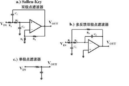 图4 Sallen-Key (a)和多反馈 (b)滤波器都是2阶,都有2个极点。单极点滤波器(c)是1阶滤波器。这些模块可以级联,以生成高阶滤波器。